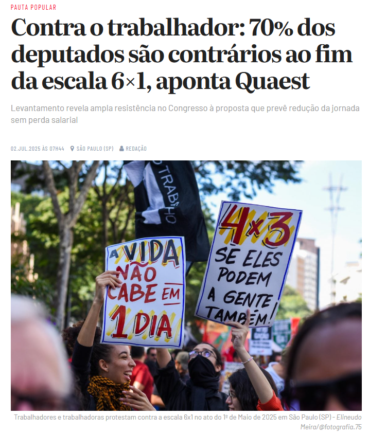 Hoje saiu uma notícia sobre a última pesquisa Quaest que apontou que 70% dos deputados são contra o fim da escala 6×1. Advinha de que bloco são esses deputados? Do Centrão e da Extrema Direita (bolsonaristas). Eles sempre são contra o povo e a favor dos milionários bilionários desse país.