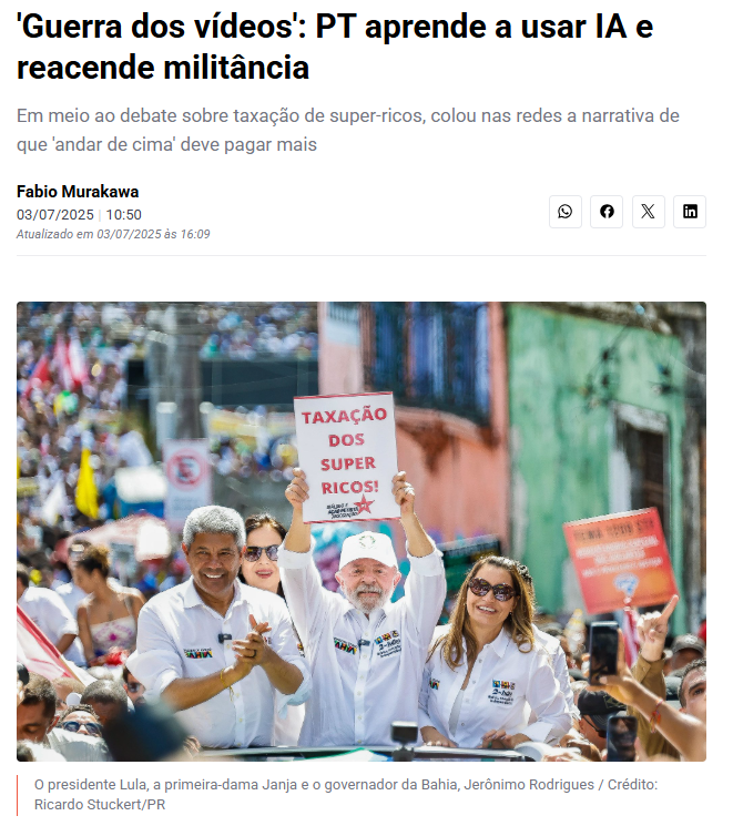 Mas há luz no fim do túnel: o PT e a militância popular começaram a usar a inteligência artificial na comunicação política – tardiamente, eu diria -, reacendendo a mobilização nas redes (leia aqui). Isso é decisivo para mobilizar o povo, expor traições parlamentares, reconstruir a narrativa política baseada em fatos, não em manipulações midiáticas e, em especial, desconstruir a narrativa mentirosa da extrema direita (bolsonaristas).