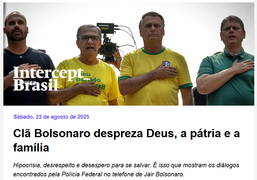 A reportagem do Intercept sobre o clã Bolsonaro , do jornalista João Filho, é o retrato fiel do que já se sabe, infelizmente poucos, mas que agora ganha registro documental: a hipocrisia e a degradação interna do clã Bolsonaro. O lema “Deus, Pátria e Família”, usado como peça publicitária por integralistas e depois reciclado pelo bolsonarismo, cai por terra quando confrontado com os áudios e prints obtidos pela Polícia Federal no celular de Jair Bolsonaro.