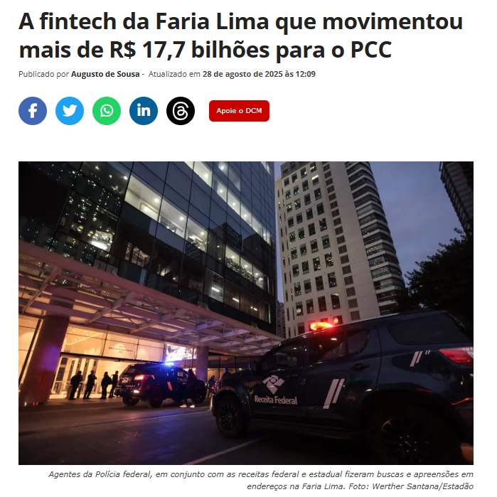 Uma fintech fundada com míseros R$ 15 mil e instalada na Avenida Faria Lima, a famosa rua do centro financeiro de São Paulo, cresceu até movimentar R$ 17,7 bilhões — incluindo R$ 2,22 bilhões ligados diretamente ao setor de combustíveis supostamente sob controle do PCC.
