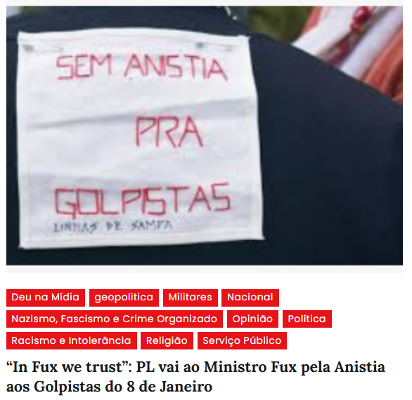 Em entrevista que repercutiu logo após a decisão, Przeworski disse: “Seria um desastre. A lição de uma anistia seria clara: pode-se levar a cabo ações criminosas contra a democracia e sair impune. Encorajaria o próprio Bolsonaro e qualquer outro líder político a tentar isso.” As palavras de Przeworski tem sido repetidas exaustivamente pelos demais ministros da primeira turma do STF, menos Fux, além do que, qualquer um, mesmo não jurista, obviamente percebe que anistiar quem tentou destruir a democracia, assassinar o presidente e o vice democraticamente eleitos, seria, sim, um convite a se tentar de novo a mesma coisa. O cinismo dos que pregam anistia só pode, então, ser entendido como uma ação continuada de golpismo, pelo que não deu certo da primeira vez.